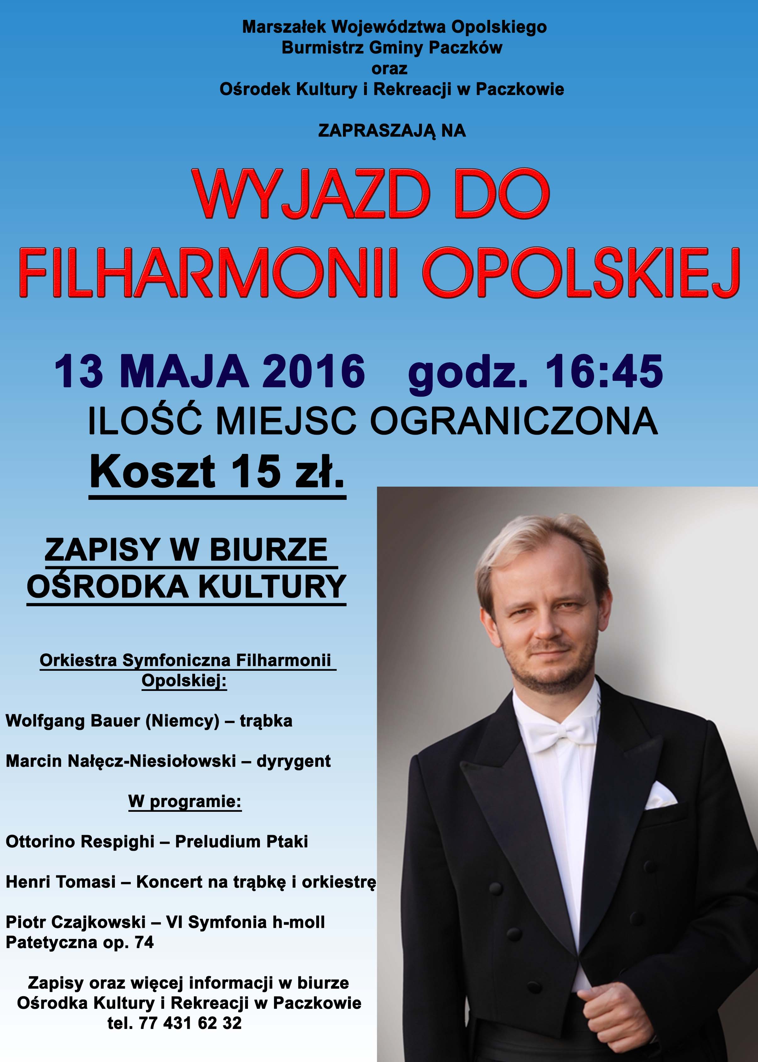 Posiadamy 20 sztuk darmowych wejściówek na koncert do Filharmonii Opolskiej, który odbędzie się 13 maja (piętek) br. Jedyną opłatę, jaką trzeba ponieść to 15 zł za autokar.
